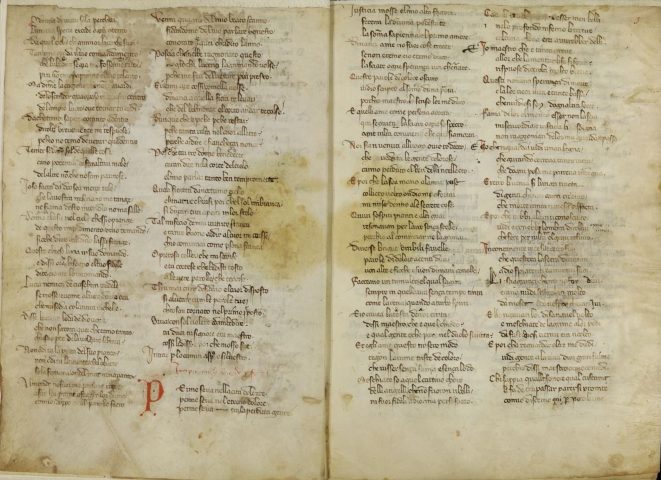 Il codice viene realizzato in Lombardia nell’ultimo quarto del Trecento da un copista che si sottoscrive come “Ianes de Parma gente lumbarda”. Si tratta molto probabilmente di un frate francescano, come il possessore quattrocentesco del manoscritto che si sottoscrive come frate Gabriele da San Giuliano. Il monastero di San Giuliano viene fondato nel 1415 appena fuori le mura dell’Aquila. Un altro possessore del codice nel Cinquecento rimane purtroppo anonimo non essendo possibile leggere il nome con cui si firma a carta 1r.